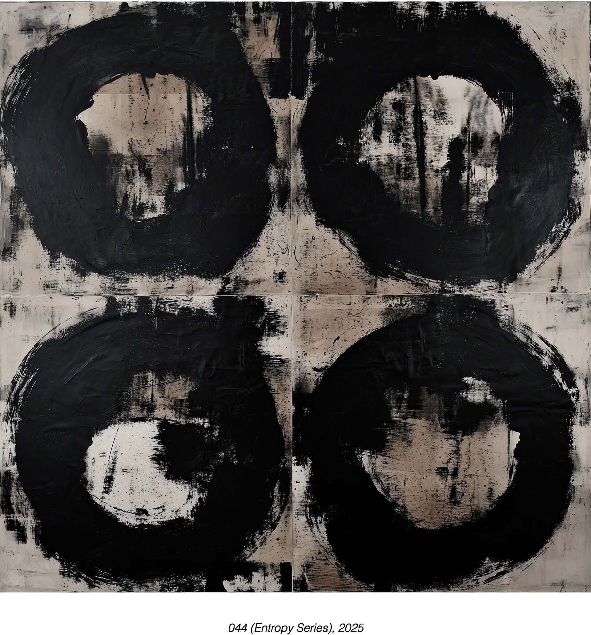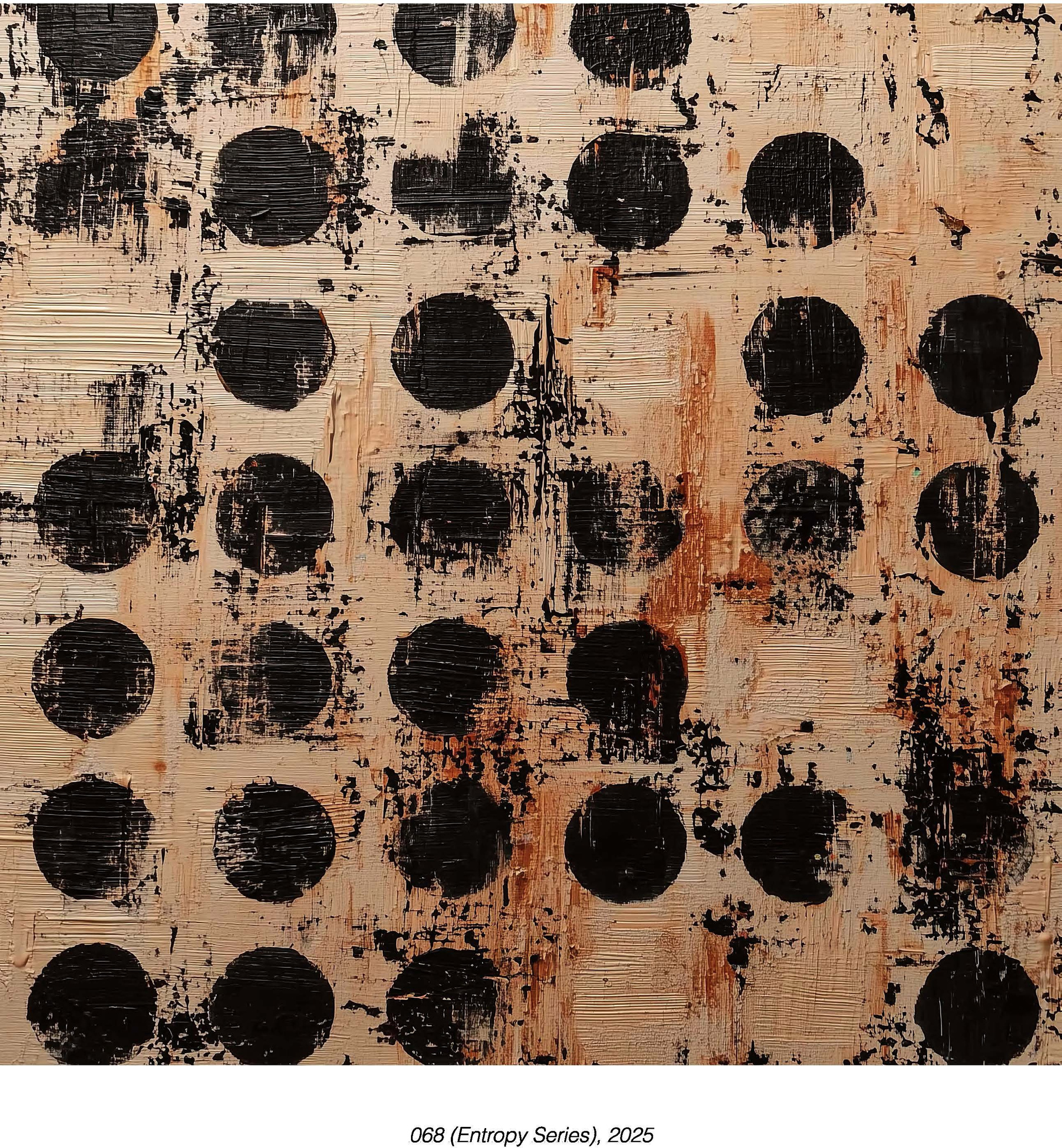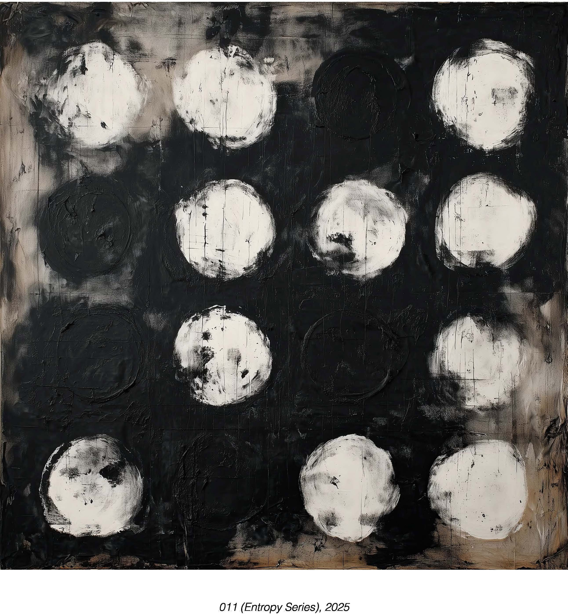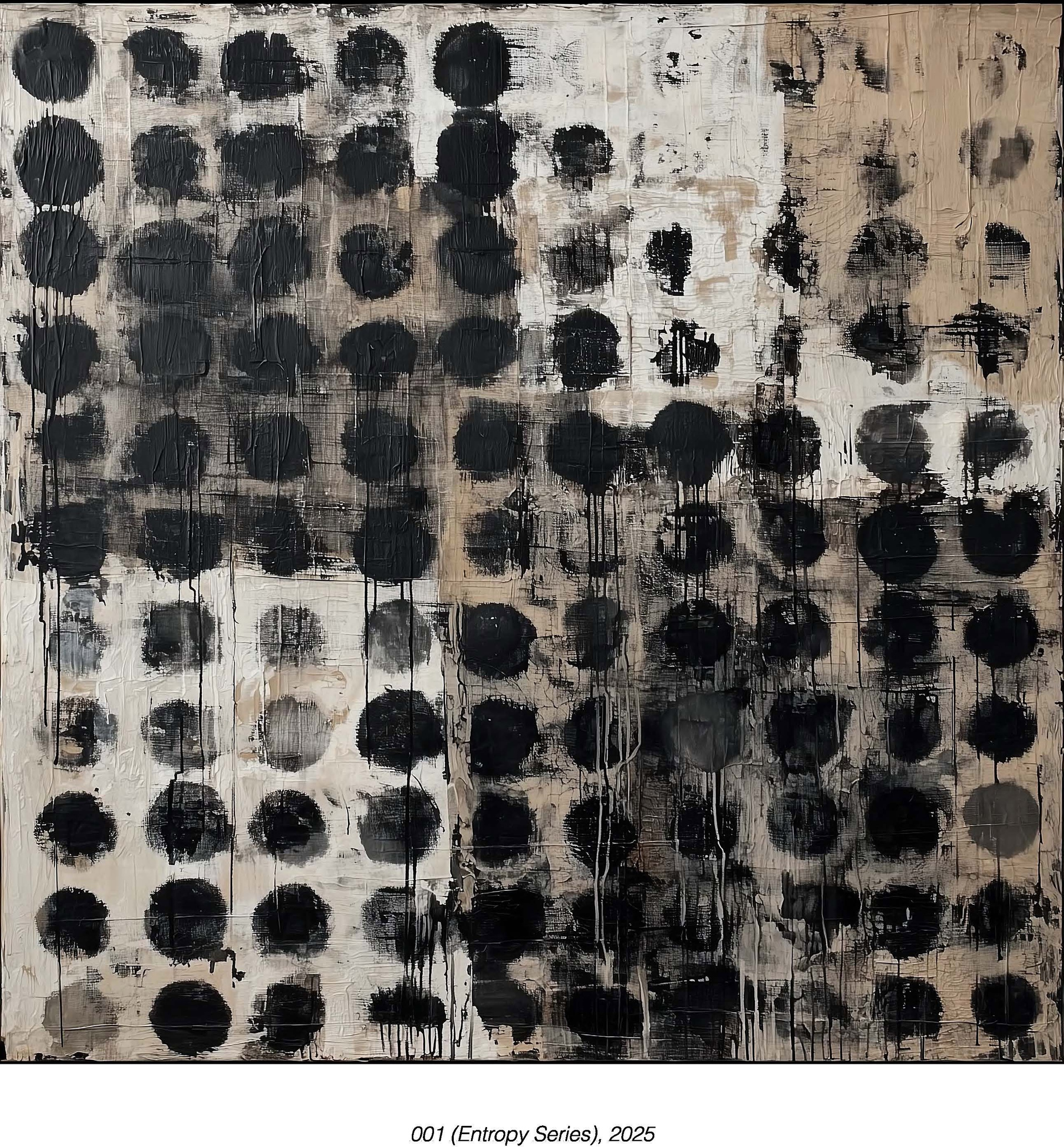 Серия исследует неизбежность распада через повторение геометрической формы. Круг — символ совершенства и полноты — подвергается систематическому уничтожению. Порядок капельниц, размытие, исчезает. Работы передают момент между структурой и хаосом, когда система всё ещё признаётся, но уже разваливается.